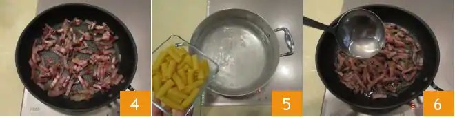 Let it sizzle on medium heat for about ten minutes until it is golden and crisp 4, taking care not to burn it. In the meantime the water will have come to a boil, salt and cook the pasta 5; while the pasta cooks, finely grate Pecorino cheese. When 2 minutes are left before the pasta is done, slow down the cooking of the guanciale by adding a ladle of cooking water. The cooking of the guanciale will stop and the starch released from the pasta will create a pleasant cream 6. Jiggle the pan a little bit to move the pieces of guanciale.