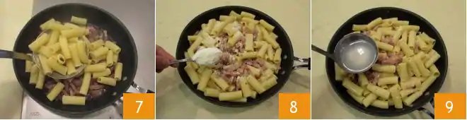At this point your pasta is done, add it directly to the sauce 7, preserving the cooking water. Stir for about 1 minute, shake the pan and stir. Then remove the pan from the heat, sprinkle with a third of grated Pecorino cheese 8 and add a little more cooking water if necessary 9.