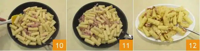Stir and toss the pasta again; you will notice that a tasty cream will have been created 11. You can then serve pasta alla gricia and garnish each plate with the remaining Pecorino cheese 12.