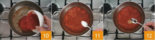 Pour in the tomato pulp 10, add a teaspoon of salt 11 and the chopped cloves 12.