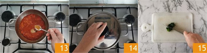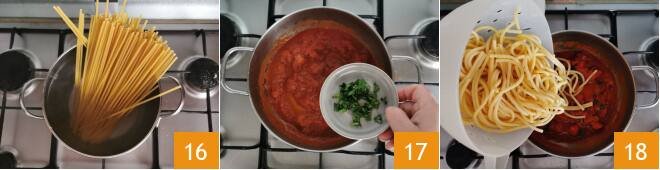 Place a pot full of salted cooking water on the fire and when it boils, add the spaghetti 16 and cook al dente. When the sauce is ready, season with the basil 17. Then drain the pasta into the pan with the sauce 18.
