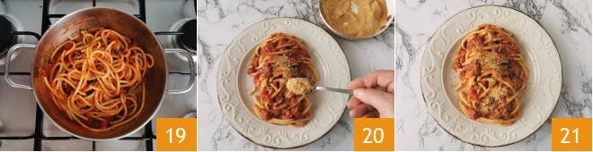 Stir and cook for a couple more minutes over very low heat 19. Pour the pasta onto a plate and sprinkle with the toasted bread crumbs 20. Complete the Paolina pasta with a pinch of freshly chopped basil, then serve it very hot 21.