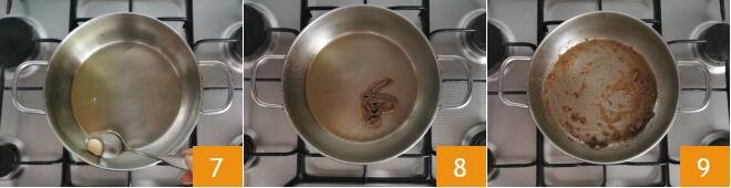 Remove the garlic 7 and add the drained anchovies 8. Heat over moderate heat, stirring, until they melt 9.