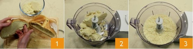 To prepare the pasta and breadcrumbs, cut a loaf of bread in half and take the soft part 1 to put in the mixer 2 to chop it finely 3.