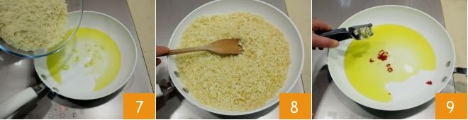 When the garlic is golden, add the breadcrumbs 7 and stir with a wooden spatula to flavor it 8 and ensure it doesn't burn: you should toast it over medium heat for about 5-8 minutes. Meanwhile, in another large pan, heat the remaining 3 1/2 tbsps of olive oil, add the chopped chili pepper and the other half of the peeled garlic clove 9.