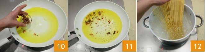 Drain the anchovy fillets from their preserving oil and place them in the pan 10, then melt them over medium heat 11. Bring plenty of salted water to a boil and cook the spaghetti until al dente 12.