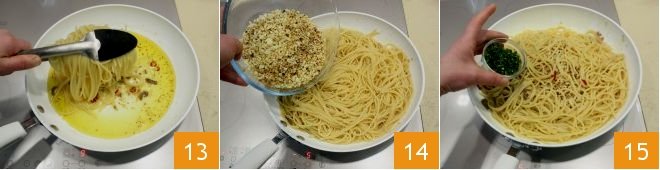 When ready, drain the spaghetti (reserve the cooking water) and transfer them to the pan with garlic, oil, chili, and anchovy fillets 13. Toss the pasta over high heat, add the toasted breadcrumbs 14 and chopped parsley 15.