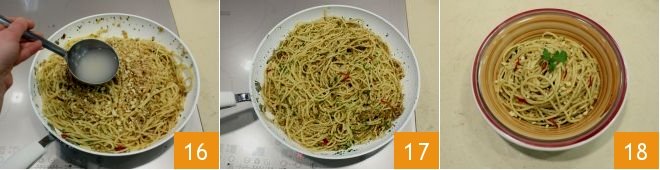 Mix and drizzle with a ladle of the spaghetti cooking water 16. The pasta and breadcrumbs are ready to be served very hot (17-18)!