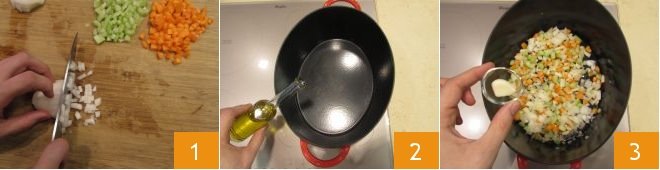 To prepare pasta and lentils, start by heating up the filtered vegetable borth: you will need it soon. Then proceed to the preparation of the sautéed base: chop the onion, celery, and carrot 1 then, in a large saucepan, pour the oil 2 and add the chopped onion, celery, and carrot 2. Then add the peeled garlic clove 3.
