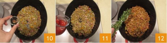 Also add the chopped dried chili pepper 10, mix in the tomato puree 11, and add the sprigs of rosemary and thyme, which you can tie together with kitchen twine 12 so that they are easier to remove later.