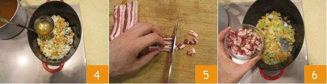 Deglaze with a ladle of broth 4 and let this mixture stew. In the meantime, cut the pancetta bacon into cubes 5 and place it into the saucepan 6.