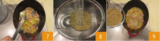 Mix all the ingredients well, then, using tongs, remove the garlic clove 7. Rinse the lentils under running water, using a sieve 8 and add them to the pan 9.