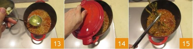 Add the broth until the mixture is well covered 13, then cover the saucepan 14 and leave to cook over low heat for about 40 minutes until the lentils are tender. Remove the sprig of herbs 15 and pour in your pasta.