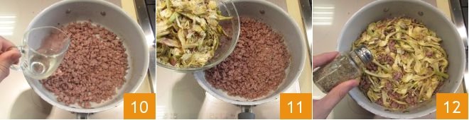 Bring a pot of salted water to a boil, which you will use to cook the pasta. In the meantime, prepare the sausage: score the casing with a small knife and gently pull it off with your hands to remove it 7, then break up the sausage using a spatula or bench scraper 8. Place the sausage in a hot pan, without the need to add oil, and brown it over medium-high heat for 7-8 minutes, stirring frequently 9.