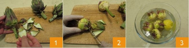 To prepare a pasta bake with artichokes, potatoes, and peas, start by cleaning the artichokes. Remove the tougher outer leaves 1 until you reach the tender ones; cut off the ends of the remaining leaves 2 and hollow out the center of the artichoke to remove the choke. Then, place them in a mixture of cold water and lemon to prevent them from browning 3.
