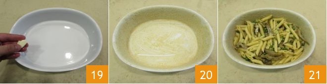 Take a baking dish, grease it with butter 19, and coat it with breadcrumbs 20. Then fill it with half of the freshly prepared pasta 21.