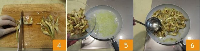 Cut the artichokes into quarters and from each quarter, cut into 4 strips 4. In a pot, prepare a sauté with finely chopped onion and a drizzle of oil, then once the onion has softened, add the artichokes 5. Let them sauté for about 5 minutes, seasoning with salt and pepper, and add a ladle of pasta cooking water 6.
