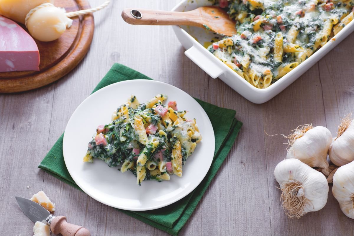 Oil a baking dish measuring 12x8 inches and place the pasta with its dressing in it 22. Level it and sprinkle grated Grana Padano DOP all over the surface 23. Bake in a preheated static oven at 400°F for 15-20 minutes (if using a convection oven at 350°F for 10-15 minutes). Remove from the oven and let it cool slightly before serving your pasta casserole with spinach at the table 24!