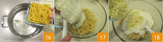 At this point, take a large pot, fill it with water, salt it, and bring to a boil. Cook the pasta until al dente 16. Then drain and transfer it to a large bowl with high sides where you will add the Grana Padano DOP cream 17 and the caciocavallo cubes 18.