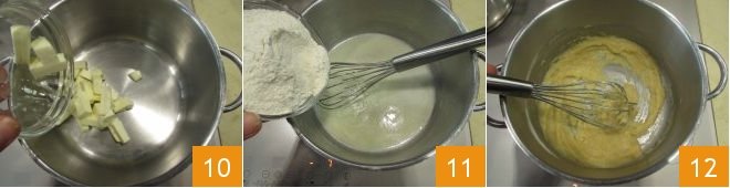 Proceed with preparing the Grana Padano DOP cream. In a high-sided pan, melt the butter over low heat 10 and, once completely melted, add the flour gradually 11. Stir with a hand whisk and let it cook over low heat to obtain a roux with a golden color 12.