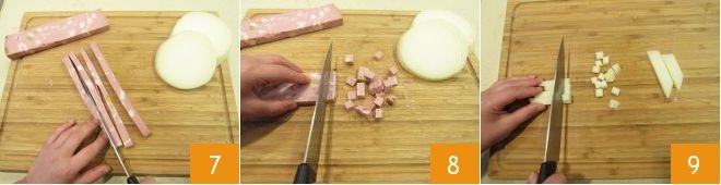 Now take the mortadella, cut it into strips 7, then into cubes 8. Do the same with the caciocavallo cheese 9. Set both aside.