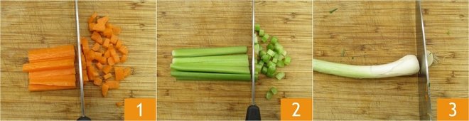 To prepare baked pasta and potatoes, start with the sauté: chop the carrots 1, celery, including leaves 2, and spring onion 3.