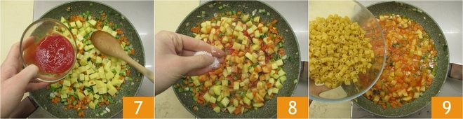 Pour in the tomato sauce 7, salt 8, and add the pasta 9.