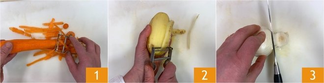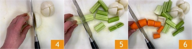 Rinse the vegetables under running water and cut the onion 4, celery 5, and carrot 6 into coarse pieces.