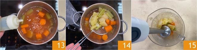 Once the cooking time is over, add a drizzle of oil 13, then drain the vegetables 14 and transfer them to a tall container. Blend with an immersion blender 15.