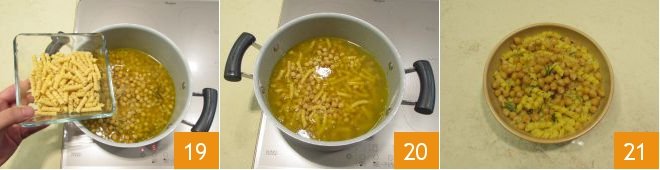 and add the pasta (if necessary, add more vegetable broth first to facilitate the cooking of the pasta) when the chickpeas are almost ready and not too mushy. Once the torchietti are cooked, your pasta in chickpea soup with bay leaf and red garlic is ready to be served! 21