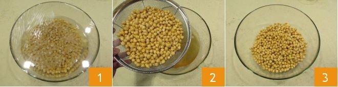 To prepare the chickpea soup with bay leaf and red garlic, first soak the dry chickpeas for 12 hours 1. After the required time, drain them 2, rinse them, and set them aside 3. Then prepare the Vegetable broth and set it aside.
