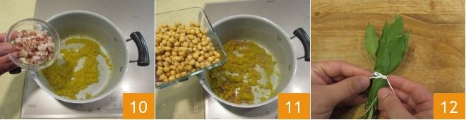 add the minced cured pork cheek 10 and the drained chickpeas 11, and let everything flavor with the sauté for 5-6 minutes over low heat. Take the rosemary and bay leaf and tie them together 12 with kitchen twine,