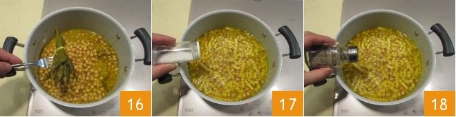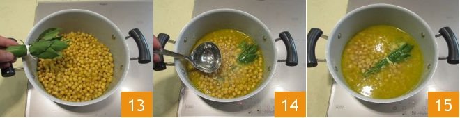 add them to the soup 13 and stir well. Add the vegetable broth 14 until the chickpeas are completely covered 15. Add a ladle of broth from time to time and cook in this way for at least 2 hours.