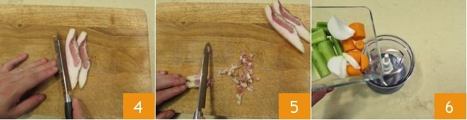 Cut the cured pork cheek first into strips 4, then mince it 5, and set it aside. Prepare the sauté: roughly chop the carrot, onion, and celery, and blend everything in a blender 6,