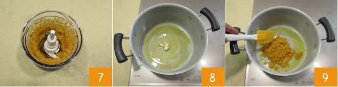 until you get a mixture with a homogeneous consistency 7. In a high-sided pot, fry the two cloves of red garlic with 3 tablespoons of oil and let them fry for 3-4 minutes, then remove them. Add the chopped mixture for the sauté 9,