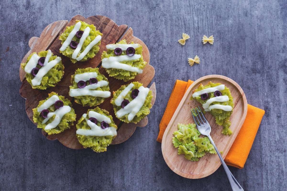 Halloween is about to arrive, and the kids are ready to knock on neighbors' doors for the traditional trick or treat? Before kicking off the spookiest party of the year, let's recharge with a themed dinner: the menu includes delicious pasta mummies: cute baskets made with small bow-tie pasta flavored with pea pesto and garnished with olives and cheese, delightful little tricks to create spine-chilling mummies that are ready to bite into! Enjoy preparing pasta mummies with the little ones and don't forget to wear your most terrifying costumes!
