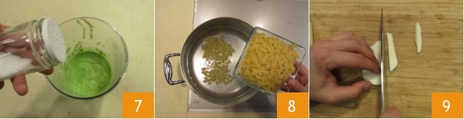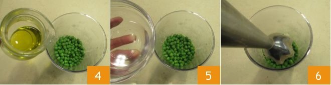 and place them in a tall glass, add the olive oil 4 and the cooking water you set aside 5, blend the mixture with an immersion blender 6 to obtain a cream.