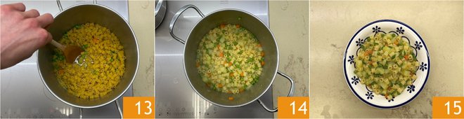 Add the onion, carrots 7, potatoes, and peas 8. Salt 9 and let flavor for 4-5 minutes over high heat, stirring continuously.