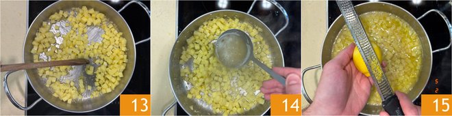 Cook on high heat for about 5 minutes, stirring constantly to prevent sticking 13. Once the potatoes are uniformly golden, cover with the hot vegetable broth 14 and continue cooking for another 6 minutes. Once cooked, off the heat, scent with grated lemon zest 15.