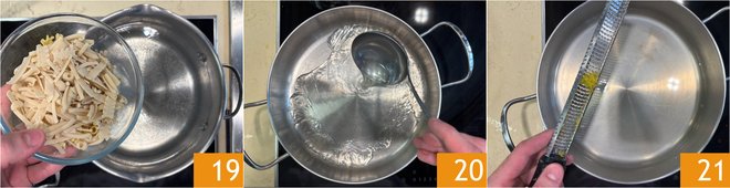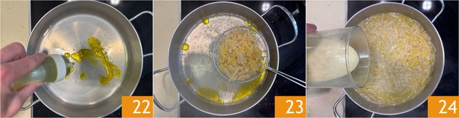 Add the oil 22 and bring to a boil. Drain the pasta and transfer it to the saucepan 23, then add the potato cream 24.