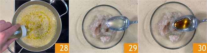 Finally, gloss with a drizzle of oil 28. Turn off the heat and let the pasta rest. Meanwhile, season the scampi tartare with lemon juice 29 and anchovy sauce 30.