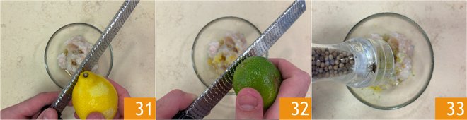 Scent with lemon 31 and lime zest 32. Add a pinch of salt and white pepper 33. Gently mix to blend the ingredients well.