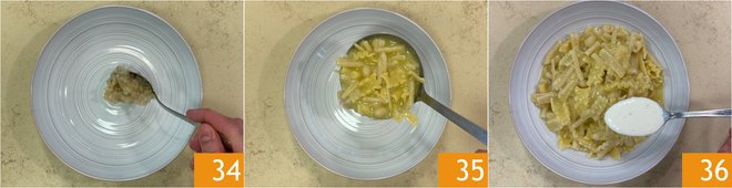Everything is ready for plating: place a generous spoonful of scampi tartare in the center of the plate 34, then add the pasta and potatoes 35 and the cheese and pepper sauce 36.