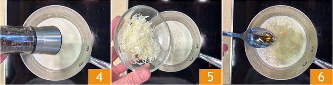 Now focus on the cheese, pepper, and anchovy sauce: pour the cream into a small saucepan, then add the black pepper 4, grated caciocavallo cheese 5, and anchovy sauce 6.