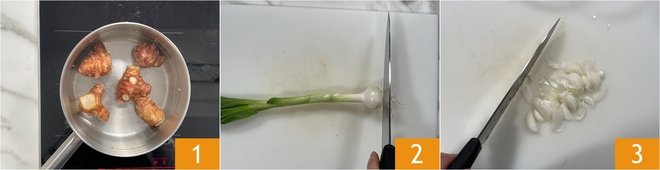 To prepare the pasta primavera, boil the Jerusalem artichoke with the skin in boiling water 1 until it is completely cooked and softened; it will take about 30 minutes. In the meantime, move on to the spring onion; remove the roots 2 and the darker green part, then slice it thinly 3.