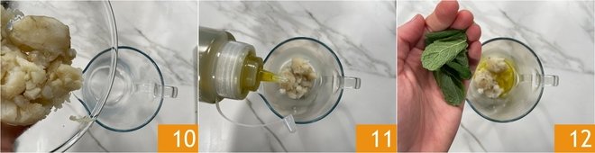 Transfer the peeled Jerusalem artichoke into a tall, narrow container 10, then add oil 11, salt, pepper, and the 3.5 oz of water. If you wish, you can flavor it with a few fresh mint leaves 12.