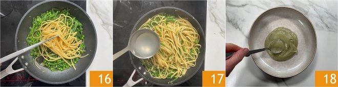 Drain the pasta al dente and transfer it directly to the pan with the vegetables 16; add a little cooking water 17, toss and mix with a drizzle of oil. Plate by placing a couple of tablespoons of Jerusalem artichoke cream on the base of the dish 18.