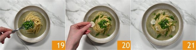 Blend well with an immersion blender to obtain a cream 13 and set aside. Cook the linguine in boiling, salted water to taste 14. Meanwhile, peel the Jerusalem artichoke for decoration and cut it into thin slices that you will season with a splash of oil 15.