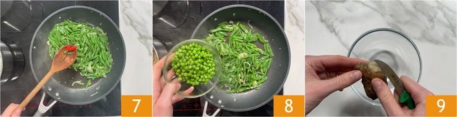 Sauté them over high heat for about 5 minutes, then remove the chili pepper 7 and add the peas 8. Continue cooking for another minute, then turn off the heat. Meanwhile, drain the Jerusalem artichoke and peel it while hot; it will be easier 9.