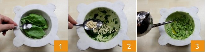 To prepare the pasta, vegetable, and pesto minestrone, start with the preparation of Genoese pesto (for the complete procedure, consult the Genoese pesto (Pesto alla genovese) guide). Gently rinse the basil leaves by soaking them in a bowl of cold water. Then dry them completely by spreading them out on a dry cloth. Next, place a peeled clove of garlic in a mortar (or a mixer with very cold blades) and crush it together with the basil leaves and coarse salt 1. Pound, rotating the pestle from left to right while simultaneously rotating the mortar in the opposite direction. As you continue to crush, add the pine nuts 2 and cheeses. When you have obtained a cream, pour in the oil in a thin stream 3 while continuing to crush. When all the ingredients are blended, the pesto will be ready. Set it aside.